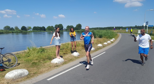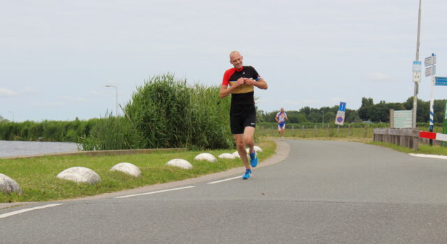 Huppakee op het zadel richting de Rotte, linksom, en zo dan! Er stond dus ook nog een aardig windje. Rob Lenting, derde na het zwemmen, had al snel een goede cadans gevonden. Met de ellebogen op het stuur sneed de Viking het snelste door de wind. Aangemoedigd door een handvol toeschouwers maakte de robuuste Delftenaar als eerste de overgang van fietsen naar lopen.