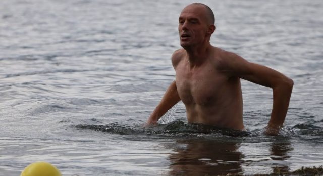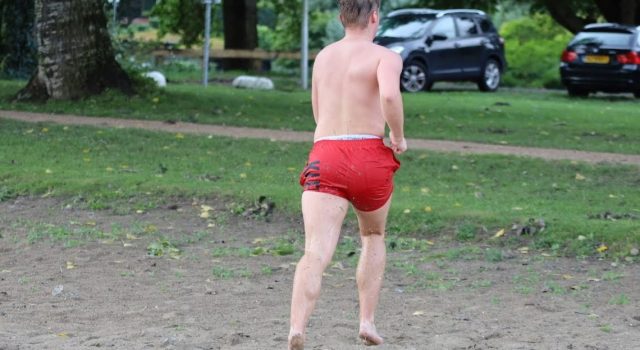 En hij was natuurlijk niet de enige die heeft gerild. Al had Marijn Nijssen gezien zijn soepele borstcrawl ogenschijnlijk weinig last van koude. De West-Fries kwam al na iets meer dan 12 minuten het strandje terug op gewandeld. Alleen Marc Hoogstrate bleef nog redelijk in zijn kielzog, maar de rest van het peloton kluunde klappertandend pas minuten later het veldje op waar de fietsen in slagorde geduldig lagen te wachten.